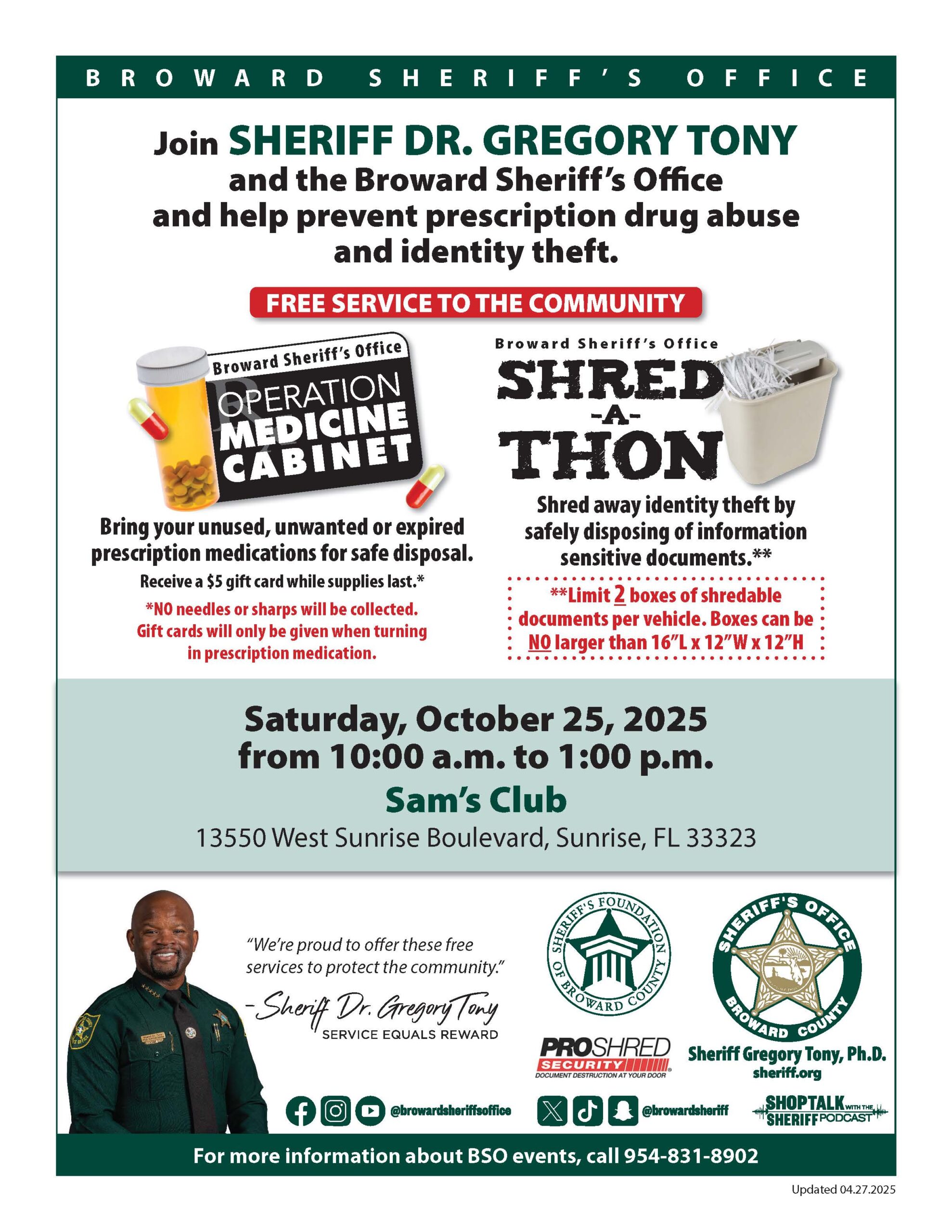 25‑10‑14 | Date: Oct 25 2025 – Got past‑date meds you need to ditch? Papers that ought to be shredded? If that’s you swing by the Broward Sheriff’s Office’s Operation Medicine Cabinet and Shred‑A‑Thon this Saturday Oct 25. The free event runs from 10 a.m. To 1 p.m. At Sam’s Club, 13550 West Sunrise Boulevard. Anyone who drops off prescription medications will receive a $5 gift card, provided supplies. Needles and other sharp objects won’t be accepted at this event. Staff will also collect any documents you bring in for shredding. You may bring up to two boxes per vehicle each no larger than 16 inches 12 inches wide and 12 inches high. For information, about this BSO event please call 954‑831‑8902 or visit www.sheriff.org.