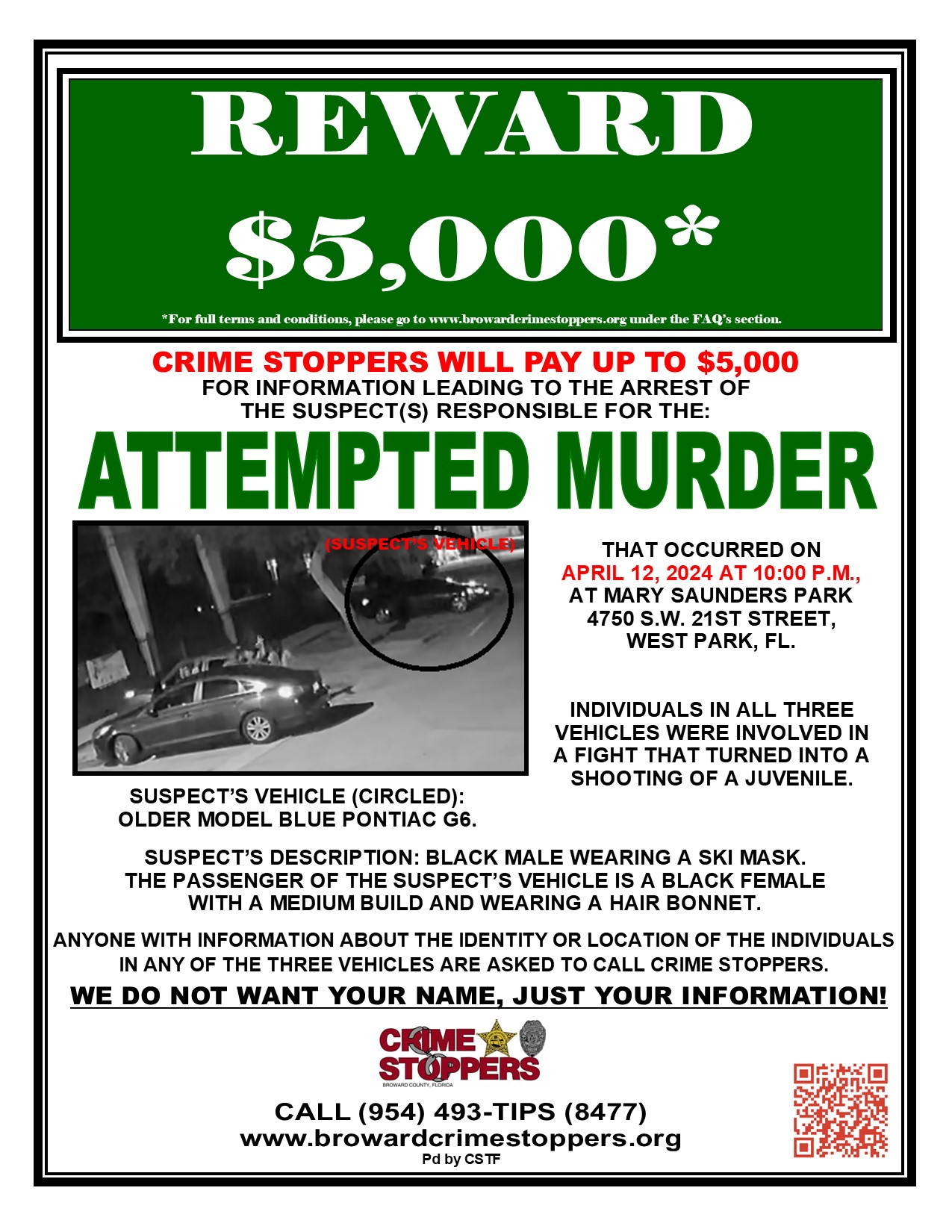 For those who prefer anonymity, contact Broward Crime Stoppers at 954 493 TIPS (8477), visit browardcrimestoppers.org online or dial **TIPS (8477) from any U.S. Cellphone. Remember, any valuable information leading to an arrest may qualify for a reward of up to $5,000.