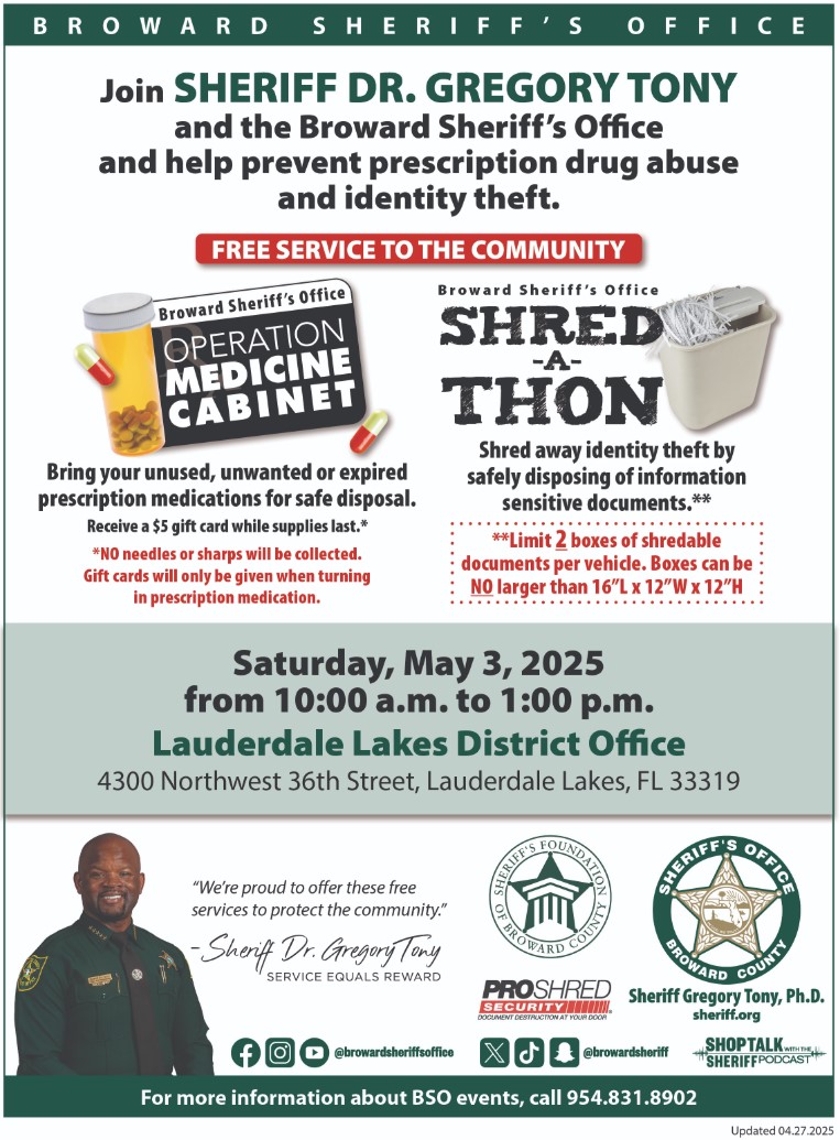 Join us at Broward Sheriffs Office Operation Medicine Cabinet and Shred A Thon event in Lauderdale Lakes this Saturday to safely dispose of your expired medications and sensitive documents! The free event will be held from 10 a.m to 1 p.m, at Lauderdale Lakes District Office on 4300 N.W 36th Street. Please note that individuals who bring in prescription medications will be given a $5 gift card long as supplies last at the event location mentioned above in the message provided by the Broward Sheriffs Office (BSO). However needles and other sharp items will not be accepted during this event for safety reasons. Additionally participants can also drop off documents to be shredded at the location with a maximum limit of two boxes per vehicle allowed for this service. Each box should not exceed the dimensions of 16 inches in length and 12 inches, in width and height. For details regarding this BSO event mentioned above feel free to contact them at 954 831 8902 or visit their official website www.sheriff.org.